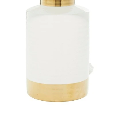 This white and gold ceramic table lamp is the finishing touch you’re traditional living room has been missing. Crafted from stoneware and featuring a white and metallic gold finished cylindrical body, the sophisticated simplicity of this stylish lighting will illuminate your space with warm light. Like the lamp body, the white drum lamp shade boasts gold finished upper and lower rims, complementing the metallic gold ring base. A smart design makes this the perfect accent piece and ambient lighting for your favorite side table or console. Uses standard 60 watt lightbulb (not included). The ceramic table lamp comes with a 65″ cord. Suitable for indoor use only. The ceramic table lamp is topped with a fabric drum shade. This traditional table lamp powers via an on/off switch. This item comes shipped in one carton. Traditional style.
