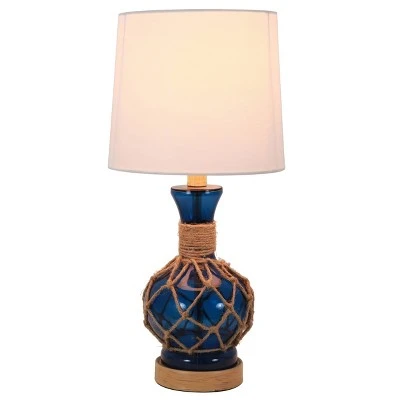 Illuminate your space with the Décor Therapy Coastal Indigo glass rope lamp. Glass and metal construction with rope accents will perfectly accentuate any costal design theme. This table lamp is equipped with a linen lamp shade and accommodates 60-watt bulb (not included). Other features include an 8-foot cord and screw shell black phenolic on/off rotary switch. Lamp measures 9w 9d 19.25h