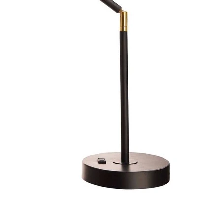 With a sophisticated industrial design, this table lamp creates a stylish effect for any room. The black finish with antique brass accents lend a charming touch to your home office while giving you needed lighting for those late-night work or study sessions. Keep your phone and other needed electronics charged up, thanks to its AC power outlet on the base.