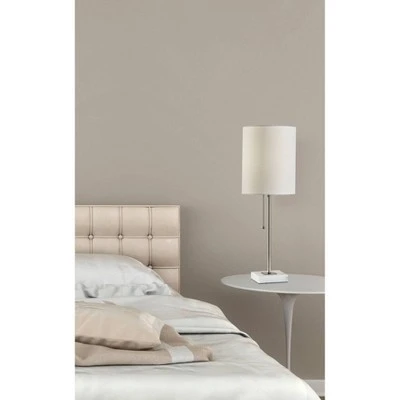 A simple silhouette is updated with high quality materials with the Fiona Table Lamp. A square, white marble base keeps the lamp sturdy and strong while adding elegance to the look. A brushed steel finish is softened with a white fabric shade that reveals its beautiful subtle texture when lit. Turn the lamp on and off with a simple tug of the pull chain switch. A clear, barely there cord trails neatly from the base.