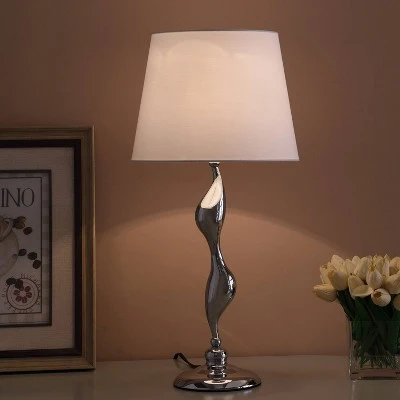 An elegant modern female art deco figurine statue table lamp body in a shiny Silver Chrome finish atop a round pedestal base. Brighten up a modern space with the stunning Erte Art Deco Female body silhouette table lamp. Decorate a modern or contemporary space with this beautiful statue lamp body that creates soft lines and a graceful sense of motion. Revel in modern expressionism with the sculpture-inspired silhouette of this Erte Art Deco table lamp. Constructed of metal material, the satin chrome finish boasts a reflective and visually striking glow. Interesting twists and curves bring a contemporary update. Great for a side table in an up-to-date living room or on a nightstand, this lamp makes a bold statement.