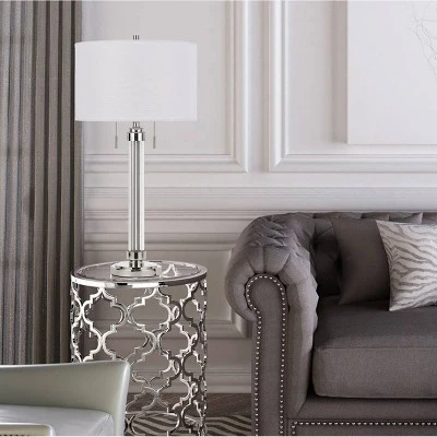 Cal Lighting makes this high styled Contemporary Metal/Acrylic table lamp comes with a fabric drum shade and is its’ 31″ tall. Brushed Steel finish. Twin pull chain switches operate the two recommended 60W bulbs (not included). One or more of these lamps will be a great addition to your office, living room, family room, or bedroom.