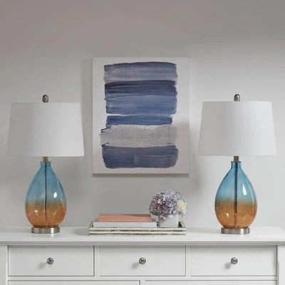 Update your space with the sleek style of the Cortina Table Lamp Set of 2. The metal and blue glass base give the lamp a striking sleek look. The white, tapered drum shaped shade softly filters the light, while also beautifully complementing the look. This table lamp is easy to incorporate into your existing space and perfect for accenting any living room or bedroom. One Type A light bulb is needed. Comes with a 2-year warranty.