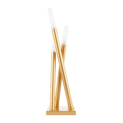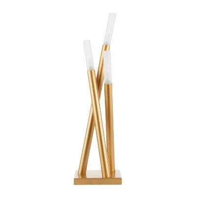 Cylindrical frosted sconces create a soft glow, accenting the modern design of the tubular metal arms on the Icicle Lamp. If you like a subtle contemporary look, this lamp is a perfect choice. Uses three 40-watt G9 halogen bulbs. This is the piece you’ve been looking for to elevate your decor! Available in brushed nickel and gold finishes.