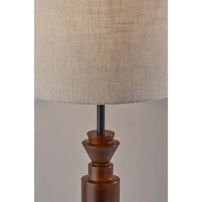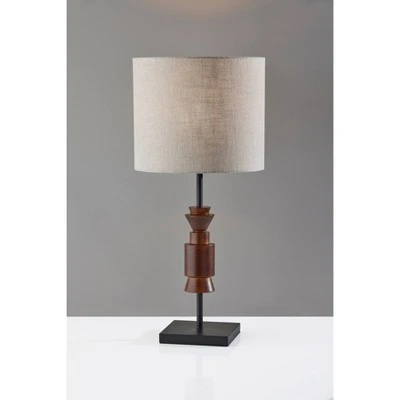 Brighten your space in modern style with the 28″ Elton table lamp. With a black metal square base and stem, the lamp brings a pop of style with a bold geometrically shaped wooden accent in walnut finish on the stem, making it the perfect addition to any modern décor. The lamp is topped off with a 13″ diameter and 11″ tall drum shade made of light beige textured fabric to softly distill the light. Operated by a rotary switch located on the socket, this lamp powers a 60W bulb (not included) and includes a 5′ black cord. The Elton table lamp is also available with a black finish on the geometric design and a coordinating light gray and white textured fabric shade.