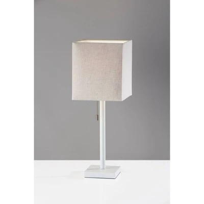 With a clean silhouette and stylish monochrome look, the 24″ tall Estelle table lamp is the perfect complement to any décor. The lamp features a square taupe fabric shade that aesthetically balances the square metal base with its matte white finish. For convenient access to power, the base includes an AC outlet located at the back. Whether the lamp is turned on or off, the AC outlet will keep working normally. Operated by a metal pull chain switch, the Estelle table lamp powers a 60W bulb (not included) and features a 5′ clear cord. The table lamp is also available in a brushed steel finish with a light gray textured fabric shade or an antique bronze finish with a light brown textured fabric shade.