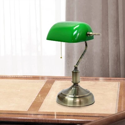 Add a touch of class to your workspace or home with this simply designed banker’s lamp. Just the right design to boost your décor with a sophisticated and professional feel, this desk lamp will be the perfect item for your lighting needs. With an antique nickel base complimented by a colored glass shade, it’s both beautiful and practical.