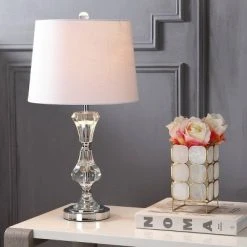 Make room for traditional elegance, as a column of crystal stacks up and sparkles from every angle. The round crystal base of our lamp continues the aesthetic while a slightly tapered linen shade enhances the light’s reflection. Topped with a crystal finish and finished with a silk-wrapped 60″ cord, this lamp will add traditional glamour to any home.