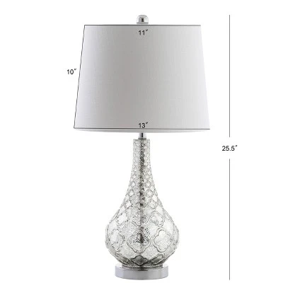 Featuring an antiqued silver finish applied within the lamp’s body, this transitional table lamp boasts modern elegance to complement any contemporary decor. The slightly tapered linen drum shade is smooth and stylish, complementing the textured quatrefoil trellis pattern on the body. Finished in a silk-wrapped cord and chrome finial, it would be lovely on a bedside table or in a living room.
