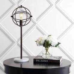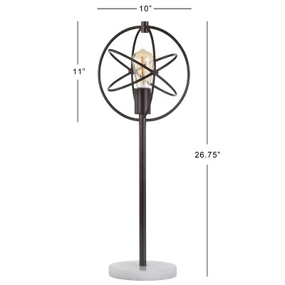 With its caged design and Edison-style bulb, this unique lamp adds an industrial touch. The bronze metal loops orbiting the bulb have a Space Age aesthetic, while the marble base is a sleek detail. This lamp is the perfect accent piece for mid-century modern or industrial style decor.