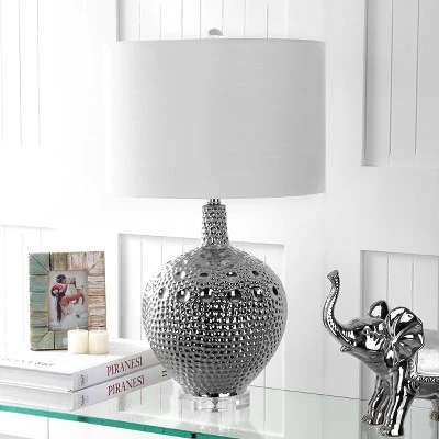 An allover silver glaze is applied to the dimpled, spherical ceramic body of this table lamp. A white linen shade and acrylic finial complete this lux design. Fashionable and functional, it is compatible with any type of light bulb — including LED.