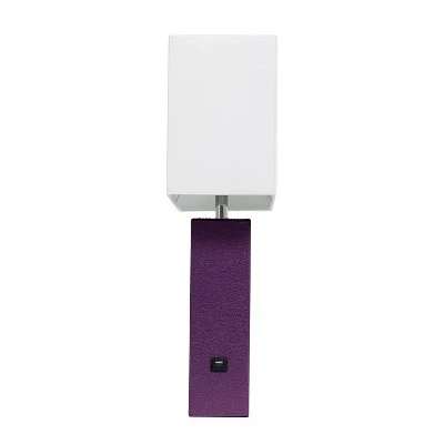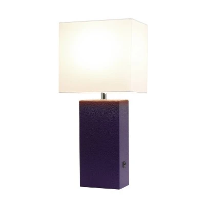 This simple yet modernized table lamp showcasing an eggplant leather body and white fabric shade is the perfect addition to your lighting needs. With a USB port on the side of the base, you are able to conveniently plug and/or charge your device. Our products are designed to enhance your room with elegance and sophistication.