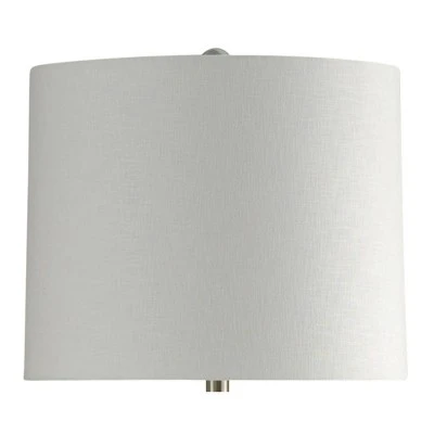 A stylish fixture with a neutral color scheme and three-way functionality, this table lamp has a ceramic frame and a hardback shade of white fabric. The finish on the frame is gray with a small section of beige at the bottom. A stylish accent for a bedroom nightstand or an office desk, this gray table lamp also looks great in a dining room, living room, or hallway. This metal table lamp uses an open metal hoop to frame out and give proportion to its look. A cool transitional look, it comes complete with a minimal hardback shade with a rolled edge for a clean finish. This piece exemplifies superior product design and great styling at an unbeatable price.