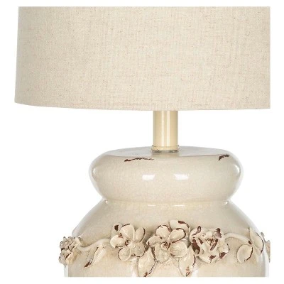 Inspired by antique Tuscan terra bianca pottery, the crackle cream ceramic Marquesa Vase Lamp is adorned with embossed trailing vine leaves. Finished to reveal earthy clay beneath the glaze, this rustic design is complemented with cream cotton shade in linen-weave texture and silver fittings. Sold in a set of two, separate the lamps on multiple nightstands or use together on a wide cabinet. It has a rotary switch for versatile lighting and has a E26 bulb base type.