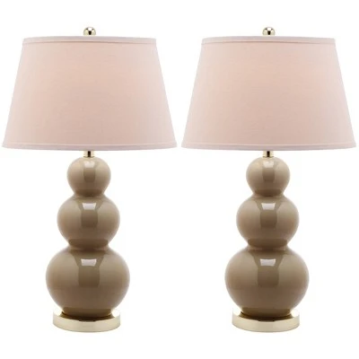 Balance fashion, form, and function with the Pamela Triple Gourd table lamp, its beautifully turned taupe ceramic gourds graduating in size. With brushed gold stand and fittings, and crisp white cotton tapered shade, Pamela adapts to any setting. Sold in sets of two. This set of two lamps are perfect for Glam or Transitional style homes.