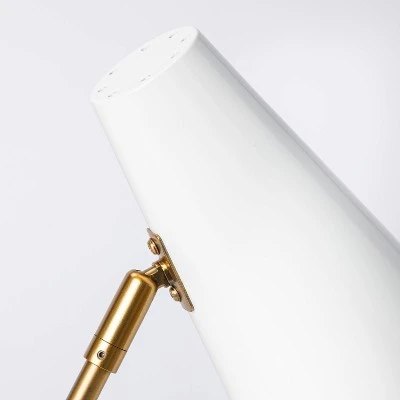 Brighten up your living room, home office or guest room with the stellar style of the Dual-Head Metal Desk Lamp from Threshold™ designed with Studio McGee. Crafted from metal, this decorative table lamp features two slender tubular metal arms that crisscross and stand on a round base, reflecting glam shine in an antiqued gold brass finish with a statement look. The two cone-shaped metal shades in bright white hang downward from the tubular arms to offer a striking contrast while helping to direct light and bathe your desk or end table surface in a soft glow. Made easy to use with a touch-activated sensor and one-way light setting, this freestanding lamp lends both style and shine to your space no matter where you place it.